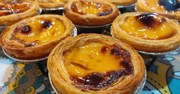 Egg tart khas Makau hadir dalam bentuk kue kering yang renyah dan bersisik, lapisan gula karamel, dan bagian tengah custard telur yang lembut