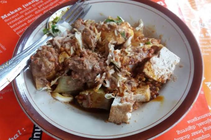 Bahan-bahan tersebut kemudian disiram dengan kuah kacang yang sangat khas karena terdapat petis di dalamnya.