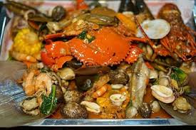 Seafood Kiloan Bang Bopak menyajikan udang segar, lobster, dan berbagai jenis kerang, dimasak dengan bumbu, saus, dan sayuran yang lezat, kemudian disajikan dalam tampilan warna-warni yang menggugah selera.