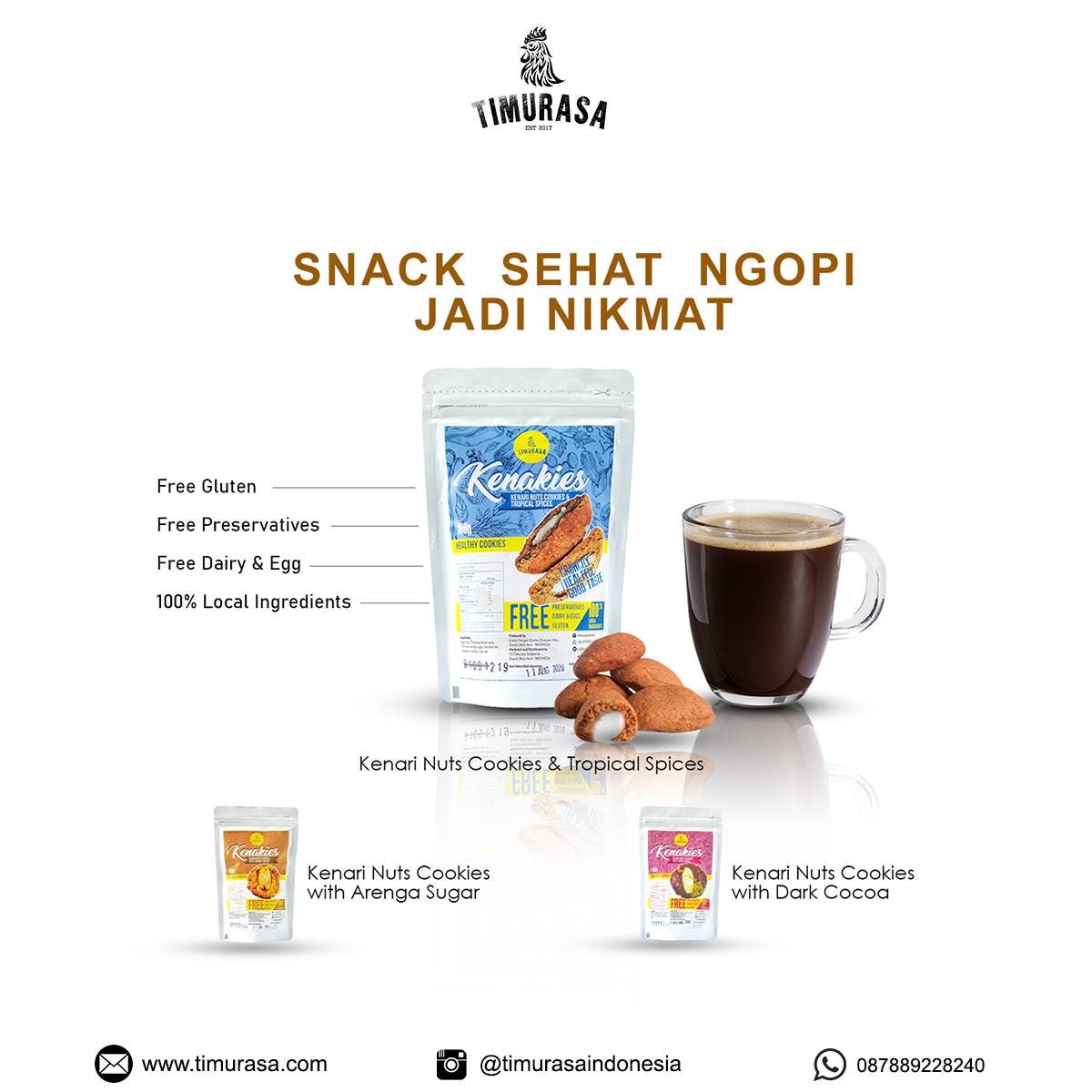 Cemilan berbahan dasar kenari ini tidak hanya lezat namun juga sehat. Kenakies bebas gluten, tanpa pengawet, dan tanpa telur dan susu dengan bahan-bahan yang semuanya berasal dari petani lokal. Terdapat beberapa pilihan rasa, Tropical Spices, Arenga Sugar, dan Dark Cocoa.