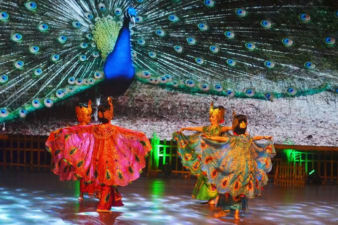 Terinspirasi oleh keindahan burung merak, para penari mengenakan kostum yang detail dan rumit dengan warna-warna cerah.