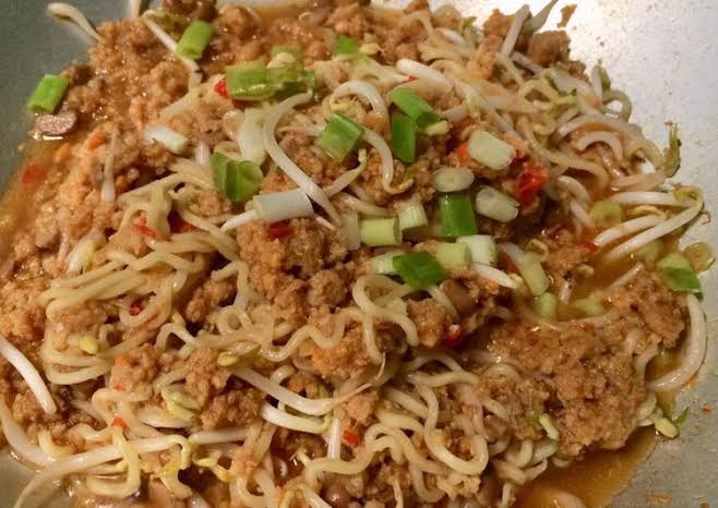 Kemudian ditambahkan mie kuning, dan irisan ketupat, lalu ditumis dengan air dan dipanaskan bersama.
