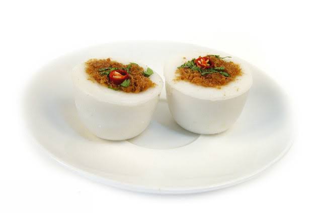 Untuk penyajiannya, pertama potong adonan menjadi bagian, lalu disiram santan dan ditaburi bawang goreng.